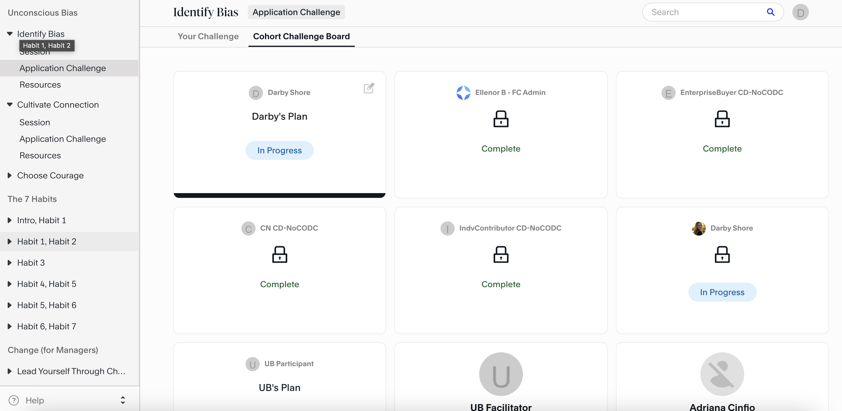 For Facilitated Courses on the Impact Platform, you can visit the "Cohort Challenge Board" to view the application challenges that other learners in your course have submitted. Those with a lock icon next to them indicate that the learner chose to keep theirs private to the other members of the course.