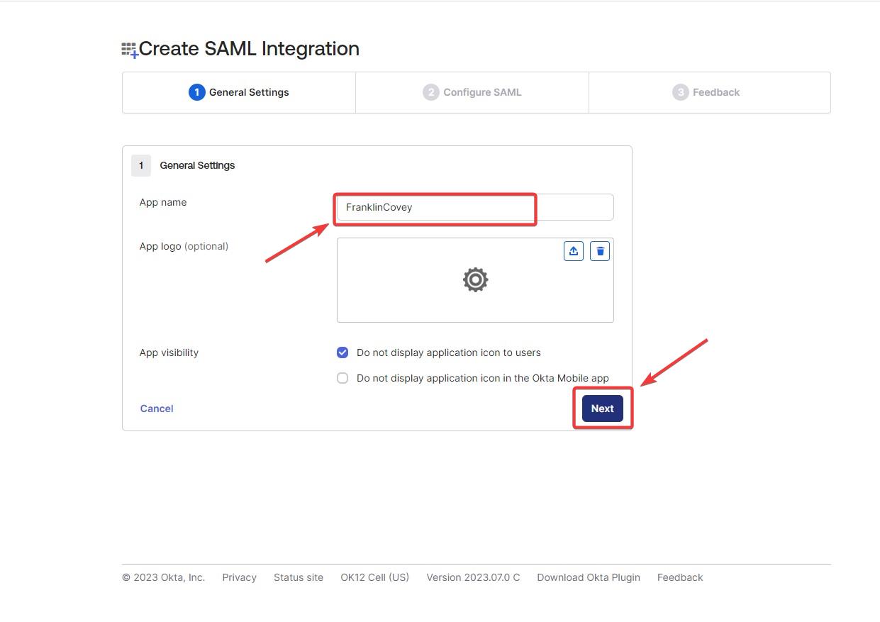 Setting up SAML single sign-on requires you to configure settings on Okta and the Admin Platform. Start by creating the FranklinCovey app in Azure. Then you can use your metadata to configure the Admin Platform SSO Management page settings using the instructions linked at the end of the article.