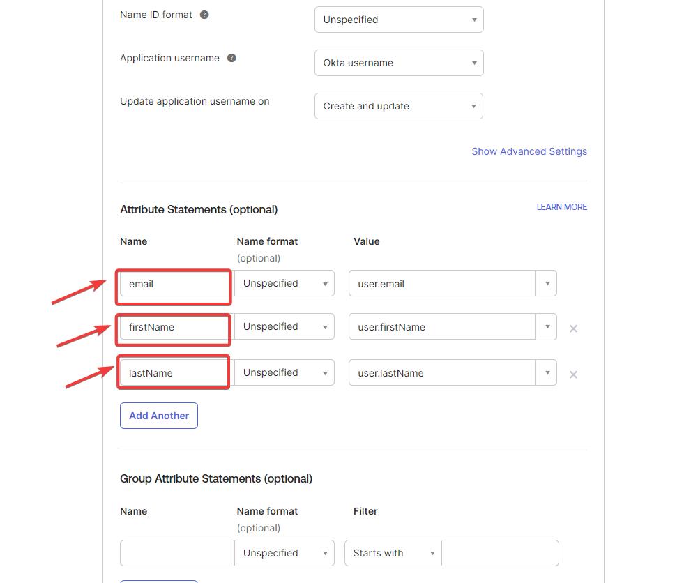 - Under Attribute Statements, map the attributes email, firstName, and lastName without any spaces.